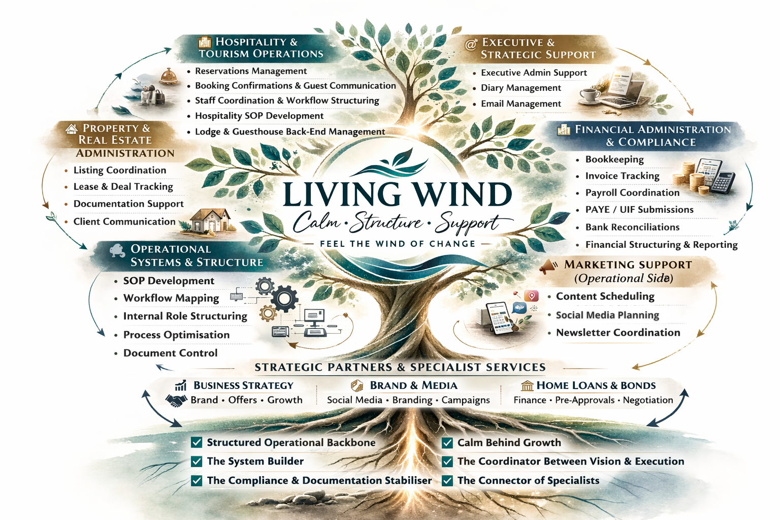 Living Wind is an online business support team providing calm, reliable, behind-the-scenes support for entrepreneurs, hospitality businesses, real estate professionals, and growing teams.